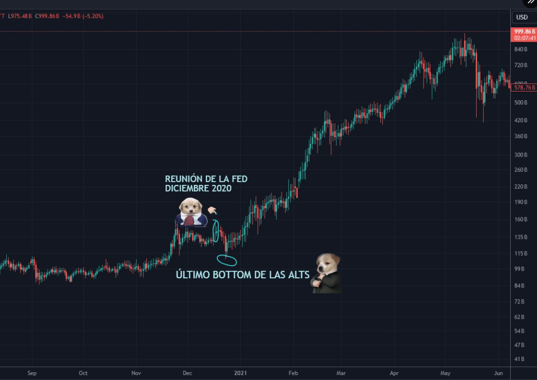 4 días después de esta reunión, se marcó el último “piso” de las altcoins y comenzaron su rally alcista que terminó en mayo 2021 📈 la fase más explosiva 💣 y jugosa 🤑
